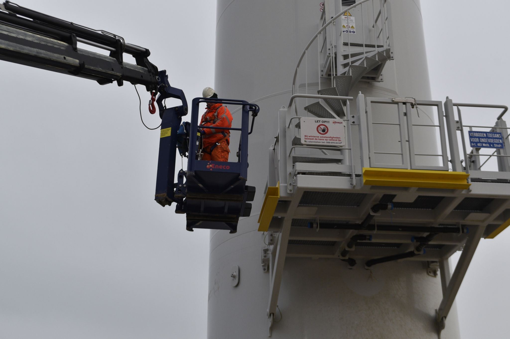 Auf dem Deltaworker ist ein Palfinger PK 23500M Autokran montiert. Dieser Kran mit hydraulisch ausschiebbarem Teleskopausleger ermöglicht eine große Reichweite und präzise Manövrierbarkeit. An dem Kran ist ein dreipersoniger Arbeitskorb mit Stahlrahmen, Sicherheitsgeländern und Handläufen befestigt. Zusammengenommen gewährleisten diese Komponenten den sicheren Transport der Monteure, selbst unter anspruchsvollen Einsatzbedingungen.