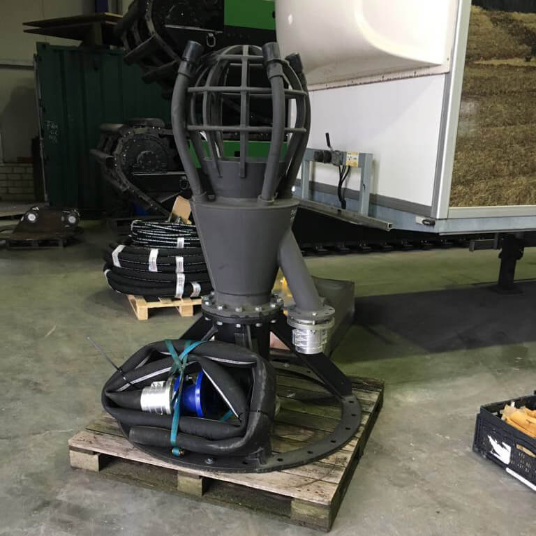 Lors de l’utilisation d’une pelle amphibie (WK 200 – WK 400), celle-ci peut être facilement équipée d’une pompe de dragage. La machine se transforme ainsi en une drague aspiratrice à part entière.