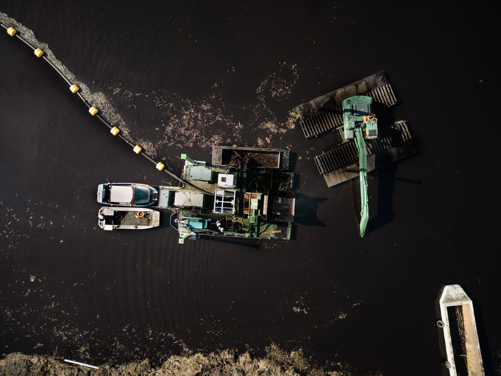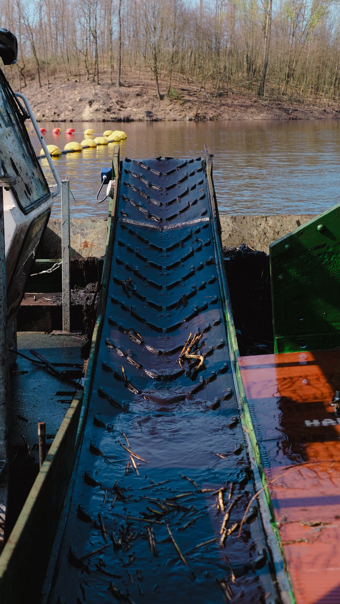 Les éléments de grande taille sont transportés par un convoyeur vers une barge à clapets, où ils sont déchargés depuis la berge à l’aide d’une pelle. Une fois les grosses pièces retirées, les matériaux de dragage restants peuvent être pompés, dans ce cas vers une zone plus profonde du plan d’eau.